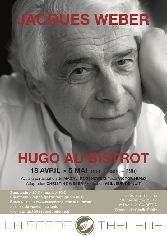 « Peuples ! écoutez le poète ! Écoutez le rêveur sacré ! » a écrit Victor Hugo*. Avec sa nouvelle création Hugo au bistrot, Jacques Weber le prend au mot et s’érige en héraut pour transmettre l’œuvre et les passions de l’auteur des Misérables et évoquer l’homme, le politique, le poète et l’écrivain. Pour cela, il lui fallait un lieu à la mesure de ce rebelle romantique dont le désir le plus ardent était de « détruire la misère qui est la maladie du corps social ». Un théâtre classique pour s’y adonner n’aurait pas permis d’instaurer une complicité suffisante pour recevoir les textes en plein cœur et en mesurer toutes les subtilités ! Jacques Weber a choisi de s’installer sur les planches du restaurant-théâtre La Scène Thélème, l’écrin idéal pour les gourmets du verbe et des saveurs, alliant le bistrot à la gastronomie. Jusqu’au 5 mai prochain, c’est dans cette ambiance intimiste que le comédien et sa partenaire Magali Rosenzweig convient une cinquantaine de spectateurs à embarquer avec eux pour une traversée littéraire nommée « Victor Hugo ». Après la griserie des mots, ces derniers pourront savourer la délicatesse des mets « coup de cœur » du comédien, concoctés par le chef étoilé Julien Roucheteau. Comme dans une ultime communion.